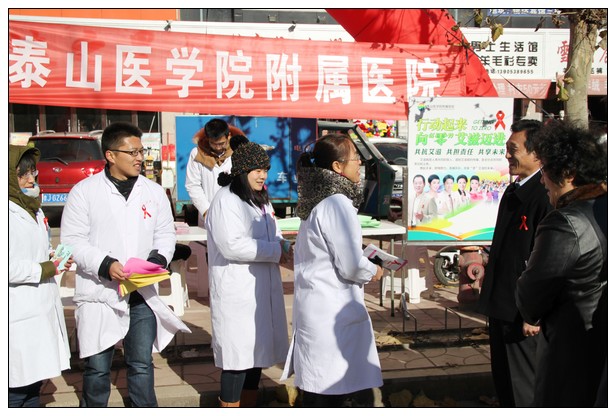 2014年12月1日是第27个“世界艾滋病日”。一大早,我院公共卫生科、感染性疾病科、皮肤病性病科专家即走上街头,向泰安市民宣传艾滋病防治相关知识,展出防艾知识展板、发放健康教育资料,提醒市民积极行动起来,“凝聚力量,攻坚克难,控制艾滋”,进一步提高对艾滋病的知晓水平和防治意识,消除歧视,努力向“零”艾滋目标迈进。
