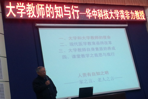最后,龚非力教授讲到了课堂教学的思与行。教师要忠诚于教育事业,善于思考医学课程教学法。建立以素质教育和通识教育为核心的教学模式,贯彻“少而精”的教学理念,将基础理论和临床实践紧密联系,调动一切手段激发医学生自主学习的积极性,以创新意识推进教学研究和改革。
