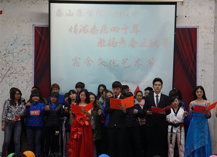 为了丰富大学生校园文化生活,引导同学们营造健康向上的宿舍文化,展现大学生良好的精神风貌,促进大学生综合素质全面提高,近日,管理学院在物理楼报告厅举办了主题为“情浓泰医四十年激扬青春正能量”的十一届宿舍文化艺术节文艺晚会。