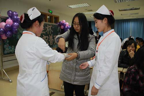 为普及实用规范的急救知识与技能,加强同学们的创伤自救能力,护理学院南丁格尔志愿服务队于2014年11月14日至16日晚,在图书信息楼1-01举行了第三届“玉兰杯”急救知识普及活动,外国语学院、化工学院等九个非医学专业学院,约四百人参加了本次活动。