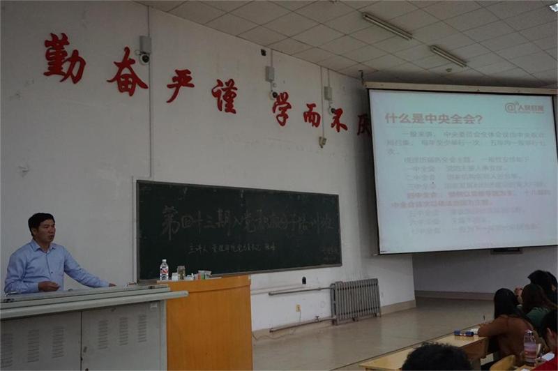11月1日,管理学院党总支书记张峰在综合教学楼C2024教室,为学院的主要学生干部、学生骨干、入党积极分子做了十八届四中全会精神的解读报告。