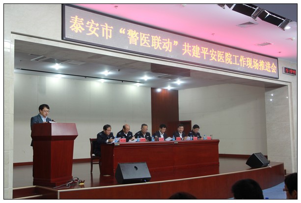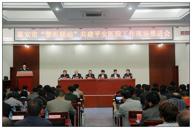 10月17日下午,泰安市“警医联动”共建平安医院工作现场推进会在我院综合病房楼学术报告厅召开。泰安市政府党组成员、市公安局局长鞠向群,市卫生局党委书记、局长刘焕星出席会议并讲话;市公安局党委副书记、交警支队党委书记高黎明主持会议;市卫生局党委副书记、副局长倪庆宾,市公安局党委委员、治安支队支队长张爱国,各县市公安局、各直属分局,各县市区卫生局,特巡警支队、反恐支队,全市辖区内二级以上医疗机构,高新区社会事业局、景区卫生环保局、新矿及肥矿医疗集团200余人参加会议。我院领导李长勤、胡建功、贾庆卫、杨晓雯、肖强、王俊勤出席会议。