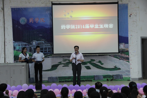 首先,药学院院长王德才为本次晚会致辞。他对毕业生们顺利地完成大学学业表达了祝贺。王德才指出,面对纷繁复杂的社会,同学们要做到三勤——勤观察、勤思考、勤动手,还要做到三思而后行,切莫手高眼低。他指出,同学们要学会做人、做事、作秀,其中“做人”是根本,“做事”是核心,“作秀”是关键,并强调“作秀”是在适当的时候以恰当的方式来表现自己。他还告诫同学们,离开大学并不意味着学习的终止,在今后的工作生活中要不断以知识充实自己,丰富自己的阅历,希望毕业生们能够勇敢地承担责任,从实际出发,从点滴做起,为母校争光,为社会做贡献。