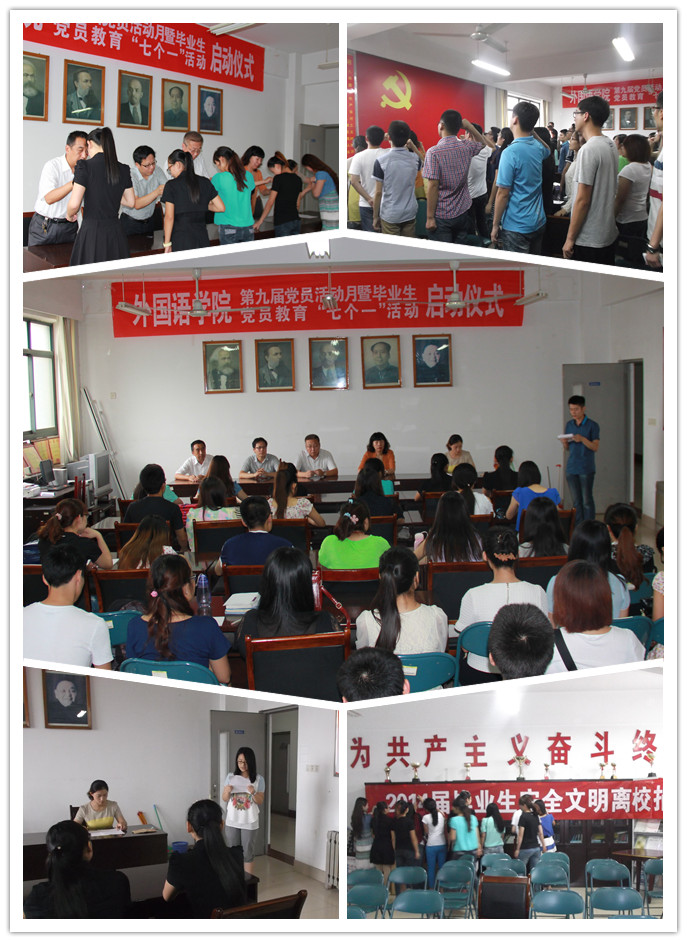 “感谢泰医恩 心怀外院情”——“七个一”活动是外国语学院党员活动月的重要组成部分,主要内容是:“一份爱心,传递无限真情——向学院赠送党建学习资料活动;一份建议,铭记外院培育之恩——我为外国语学院发展建言献策活动;一次清扫,泰医因我更美丽——党员教育实践示范点志愿清扫活动;一次交流,助力学弟学妹成长成才——毕业生经验交流会活动;一次宣誓,踏上人生新征程——重温入党誓词活动;一份使命,外院因我而自豪——争当优秀毕业生活动;一次坚守,为毕业生文明离校保驾护航——我送全体毕业生离校活动。”