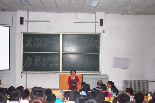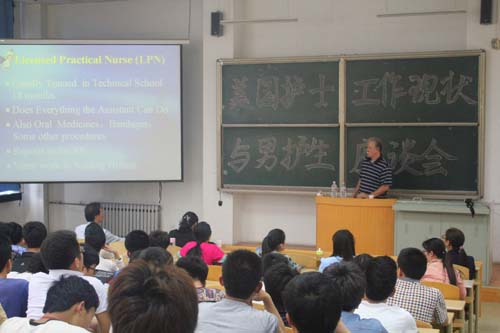 5月13日下午4:00在教学北楼A3006教室开展了关于“美国护士工作现状”的座谈会。座谈会特别邀请了具有丰富临床经验及教学经验的美国西弗吉尼亚大学护理学院助理教授、急诊科开业护士Daniel J. DeFeo先生与同学们进行交流。护理学院院长刘化侠,薛雅卓教授均出席了此次座谈会。座谈会由副院长吕春明主持。护理学院2010级、2011级、2012级以及专升本全体在校男生参加。