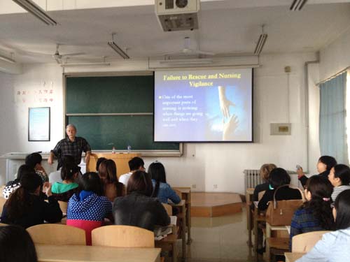 5日上午9:00,DeFeo先生在教学北楼A4003开始了来校讲授《急危重症护理学》的第一节课,中英合作班学生、研究生和护理学院教师参与了课堂教学活动,Daniel J. DeFeo此次应邀来校除了为本科、专升本、中英合作专科三个层次学生讲授《急危重症护理学》部分课程外,还将与学院男护生进行座谈、为学院教师讲授专业英语、参观附属医院急诊科等相关活动。