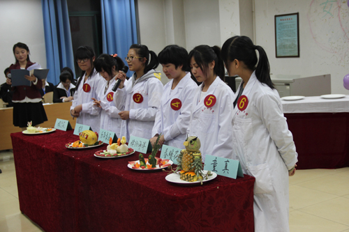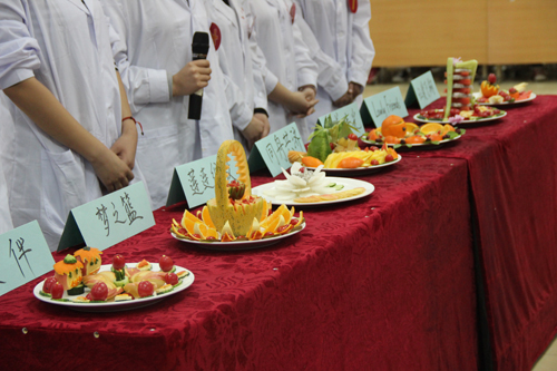选手们争分夺秒的制作过程中,场下观众与主持人也积极互动,被誉为“快乐水果”是哪种水果、感冒忌用哪种食物等问题,不仅调动了现场的气氛,而且丰富了同学们关于饮食的基本知识。经过激烈的比拼,来自2013级化学制药技术专科2班代表队的《蝶恋花》及2013级药学本科3班代表队的《让爱飞翔》获得了本次比赛的一等奖。