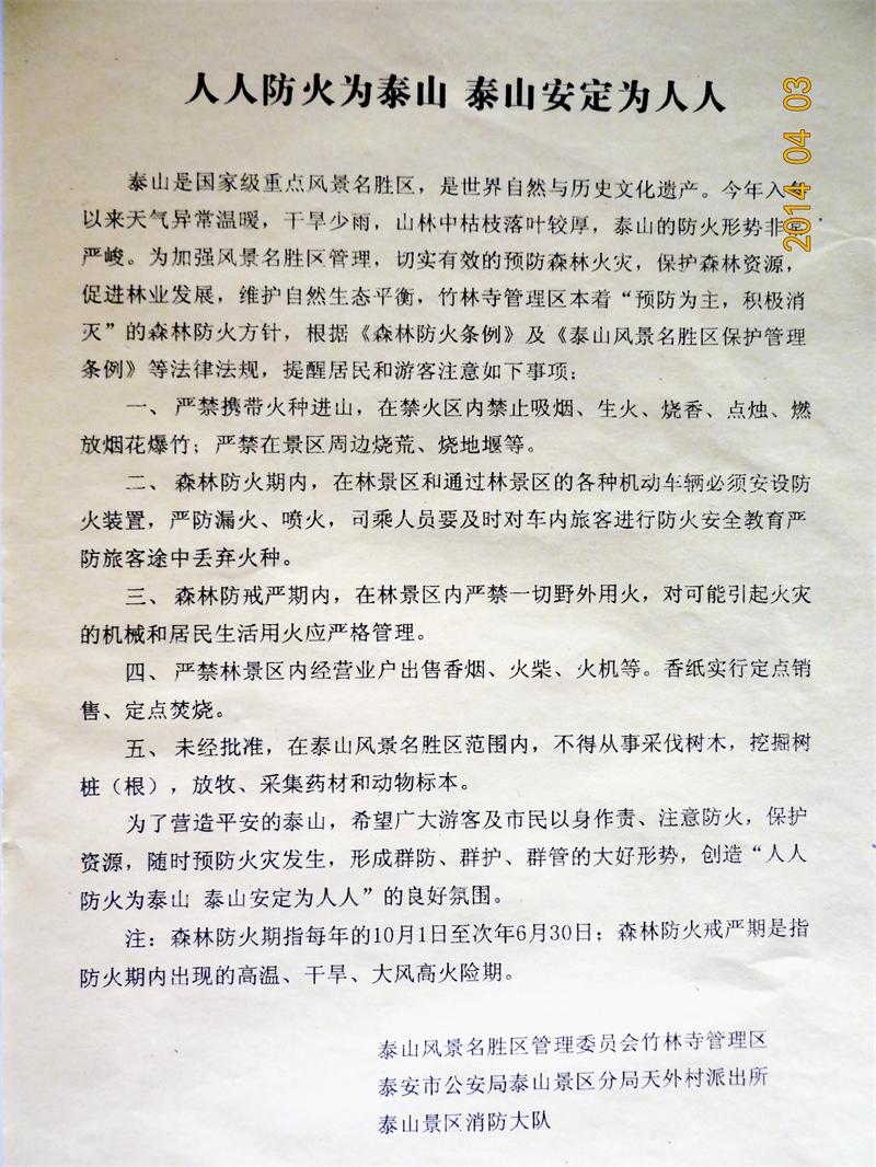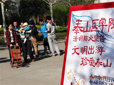 2014年4月3日,人口与计划生育学院与保卫处联合开展了“文明出行,珍爱泰山”清明防火宣传活动,发放宣传材料2000余份。很好的配合了泰山管委、泰安市公安局景区分局、泰山森林公安分局、泰山景区消防大队的泰山防火工作,为杜绝我校师生员工在泰山景区违规用火打下良好基础。
