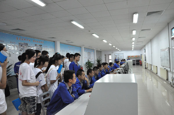 化工学院暑期社会实践团与山东汇丰石化集团领导、企业工程师进行了座谈。在座谈中,化工学子了解了企业发展概况、企业文化和企业人才需求。在企业工程师的带领下,团员们参观了厂区的重点车间和主要产品的生产工艺流程。在参观中,壮观的大型生产设备和整洁、现代化的操控室令化工学子大开眼界。在熟悉企业设备结构、工艺流程的同时,大家结合自己专业知识,时时与公司工程人员进行技术交流。