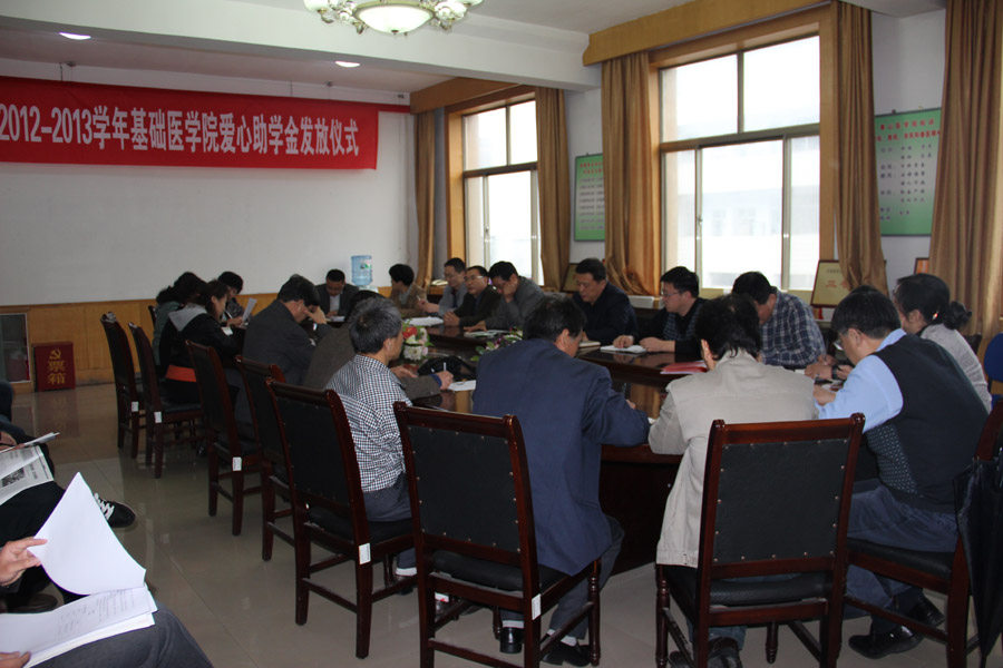 5月8日下午,基础医学院2012-2013学年爱心基金发放仪式在天外村校区基础医学院会议室举行。设立爱心基金是为了向家庭困难的学生奉献一份爱心,帮助其顺利完成学业,增进师生之间的团结和友谊,增强全体师生的凝聚力,倡导良好的道德风尚,促进校园精神文明建设。