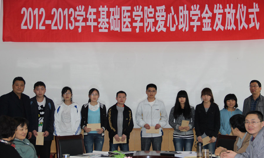 共有来自基础医学院的8名同学获得爱心助学金,受助金额每人500元,共计4000元,此次发放的爱心助学金全部来自基础医学院全体教师慷慨解囊,踊跃捐款。学院院长景学安宣布了获得助学金的学生名单并发表了讲话,希望受资助的同学好好学习、全面发展,将来成为社会有用之才;表示今后在教师捐款的基础上,还将动员广大校友和社会爱心人士来帮助品学兼优、生活困难的学生。受资助的学生代表李由召同学做了发言。学院院长景学安、党委书记王昭金向获奖同学颁发了助学金。