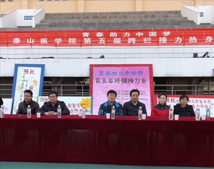 2013年4月11日下午,由共青团泰山医学院委员会主办,运动医学与康复学院承办的“青春助力中国梦---泰山医学院第五届跨栏接力热身赛”在校本部新体育场举行。校团委副书记刘祥雨出席活动。运动医学与康复学院党总支副书记刘方永、各院系团总支书记和我校十二个学院的运动员参加了本次活动。