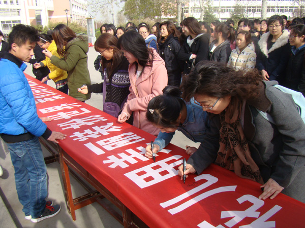 为了迎接省教育厅对我校宿舍管理工作的检查评估,进一步加强我院宿舍文化、校园文明建设,巩固和发扬优良学风和校风,提高学生的个人修养及综合素质,4月8号下午, 化工学院全体学生在学生会带领下在松竹园楼前举办“文明修身,从我做起”宣誓签名活动。