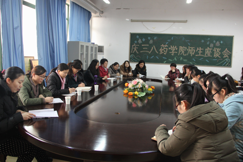 为迎接第104个国际妇女节,药学院相继开展了“走过花季,我药精彩”征文比赛、“相亲相爱,共享成长”座谈会和幸福留言板等系列活动。为了进一步加强师生交流,药学院于3月6日下午在教学北楼A5017召开了“庆三八”师生座谈会。药学院党总支副书记张鸣凤,各教研室女教师及女学生代表参加了本次会议。