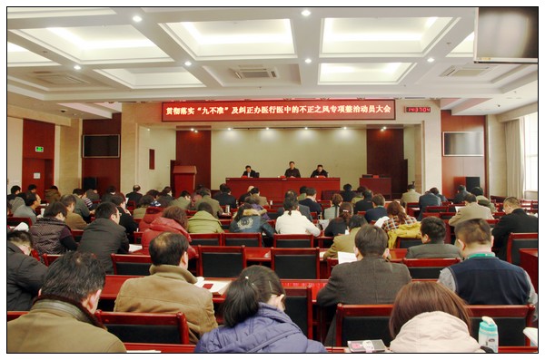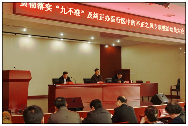 2014年1月16日下午,我院贯彻落实“九不准”及纠正医药购销和办医行医中的不正之风专项整治工作动员大会在综合病房楼学术报告厅召开。会议由院长李长勤主持,全体院领导及200余名中层管理人员参加了会议。