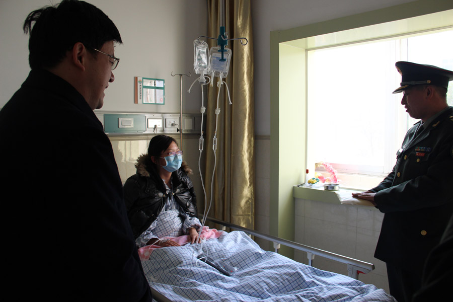 12月4日上午,济南军区某部特侦营教导员张国伟、连指导员张兵兵代表特侦营全体官兵看望了病中的徐盼同学,并送上全营官兵的祝福和慰问金。张国伟教导员鼓励徐盼同学要树立信心,积极配合医生治疗,要坚强勇敢地面对,顽强战胜病魔,争取早日康复,重返校园。