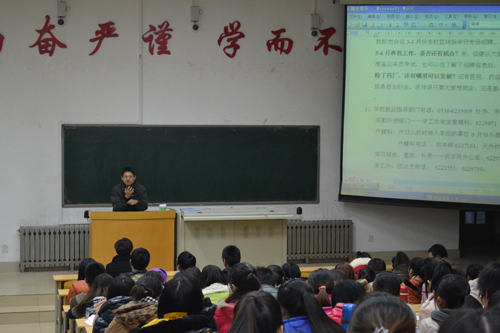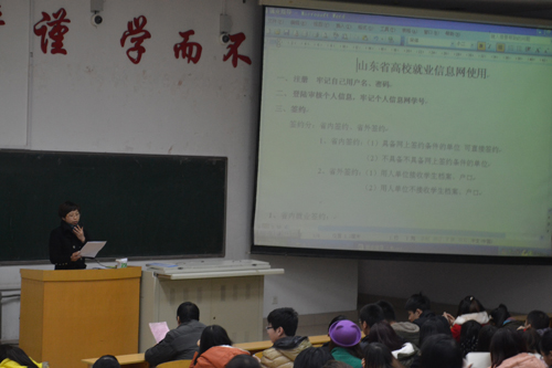 首先,药学院学工办副主任周延萌向同学们介绍了山东省高校就业信息网的使用方法,并就网站注册、招聘信息查询,与用人单位签约等方面做了详细的说明。随后,周老师针对档案与户口、实习期间待遇、准备毕业面试等问题,结合以往的事例同毕业生们做了深刻的探讨,她还提倡同学们逐步做到实习与就业一体化,警惕传销组织,注意自身安全。此外,周老师提醒同学们要及时关注就业信息,积极参加本学期的就业招聘会,增加个人阅历和社会经验。最后,乔峰老师指出,毕业生应该以积极乐观的心态面对毕业就业,认清考研与就业的关系,全面考虑,纠正择业观,同时,提醒同学们要更加谨慎地对待就业签约问题,希望同学们学会如何保障自己的合法权益,并鼓励同学们参与各种单位的面试,提高自我能力。