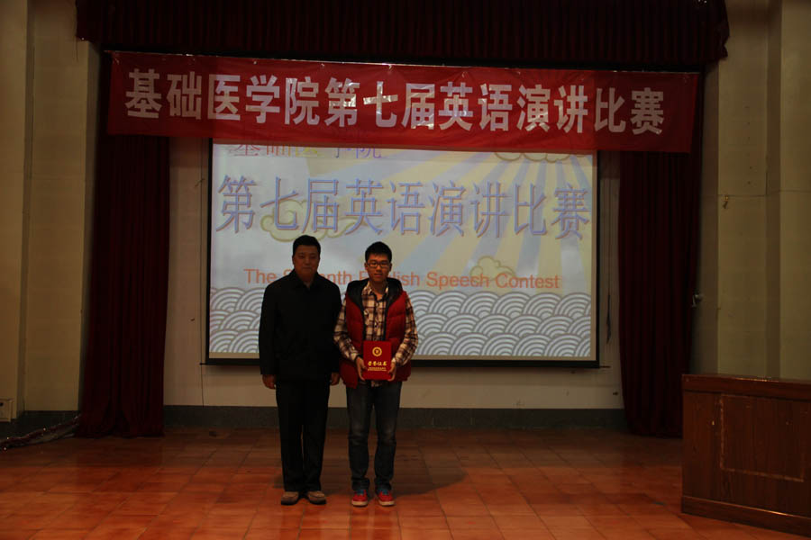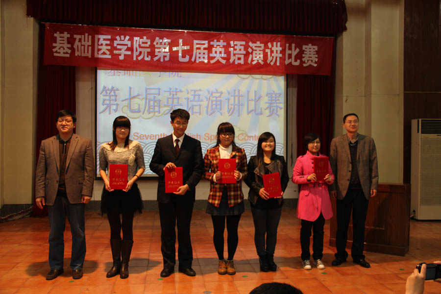 比赛首先通过一段视频回顾初赛精彩瞬间,赛程分“自由演讲”、“选题演讲”两个环节,选手们精心准备,评委互动频繁,场下观众热情洋溢。经过激烈角逐,2012级临床医学本科11班李润亭以出色的表现夺得桂冠,2012级临床医学本科5班马成林、2012级临床医学与英语本科1a班马清悦获得二等奖,2012级临床医学与英语本科1b班陈永坤、2011级临床医学本科5班王媛媛、2012级临床医学本科13班郗夏颖、2012级临床医学本科14班杜雪莹、2012级临床医学本科15班薛晨月获三等奖。