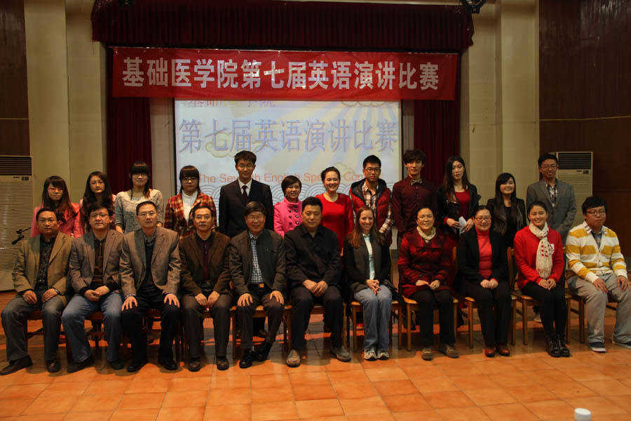11月1日晚6:30,基础医学院在天外村校区视听中心举办了第七届英语演讲比赛。来自临床医学与英语、临床医学两个专业的8位选手各展才能,为观众献上了一场精彩绝伦的比赛。外教Melissa老师、生理学教研室主任张延玲教授、外国语学院秘书赵颖老师、专业英语教研室赵艳萍老师、阿斯顿外语学校张婷老师、2011级临床医学与英语本科2b班贾文彬同学担任本次比赛的评委。