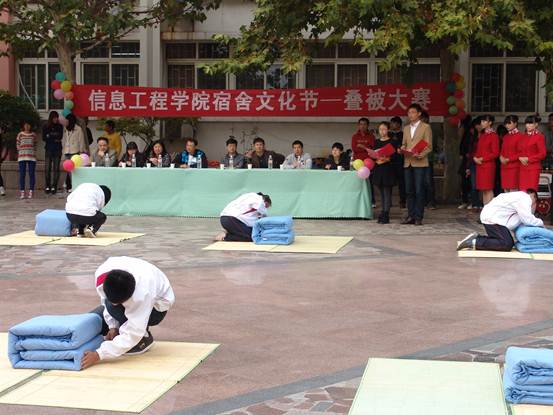 为弘扬集体主义精神、培养学生独立自理能力、营造和谐文明的宿舍文化环境,10月18日下午,信息工程学院第七届宿舍文化节开幕式暨叠被大赛在平安广场举行,大学生公寓服务中心主任胡作铭应邀参加了本次活动。