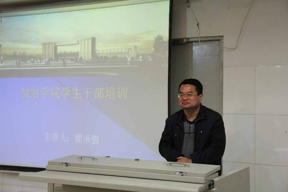 10月15日晚,放射学院学生干部培训会在放射楼二楼正式开课。由放射学院党总支副书记翟承强老师主持召开第一讲,放射学院第30届学生会全体干部成员以及2013级各班级班委共150名学生骨干参加了培训。