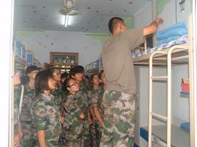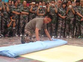 首先是学习怎样叠被子,教官现场演示并讲解了相关步骤,叠被子“三分叠,七分整”,将被子压出一道道整齐的痕迹,再根据痕迹将被子叠好成型。随后,教官带领全体同学们进入学生宿舍,讲解宿舍内的生活用品和被褥的摆放,同学们用心倾听,仔细观看,学习劲头十足。