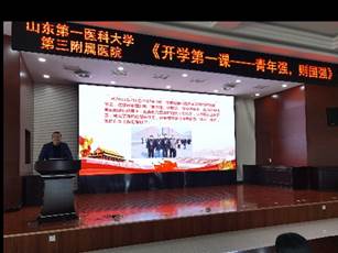 为庆祝建党100周年,激发在院实习生及带教研究生的爱党爱国爱社会主义的情怀和热情,3月4日下午,山东第一医科大学第三附属医院通过“开学第一课”的方式,让学生们学习中国共产党的历史,聆听共产党员的先进事迹。