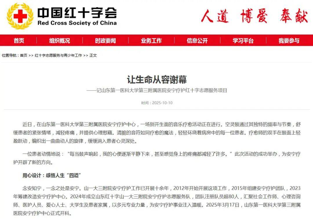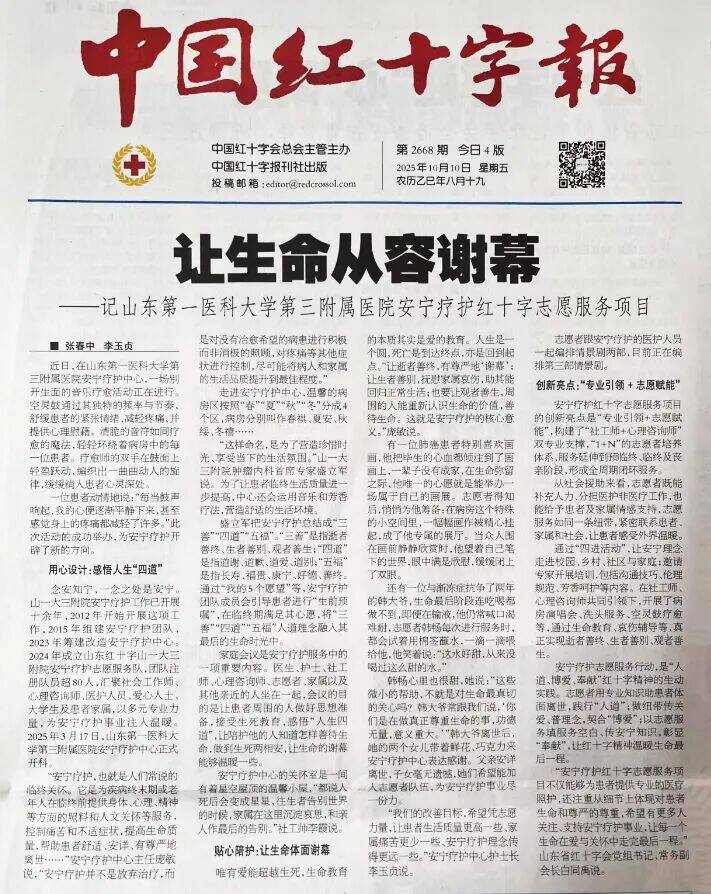 近日,山东第一医科大学第三附属医院安宁疗护红十字志愿服务项目——“让生命从容谢幕”,凭借其在生命关怀领域的专业实践与社会价值,正式刊载于《中国红十字报》,并同步在中国红十字会官方网站发布。