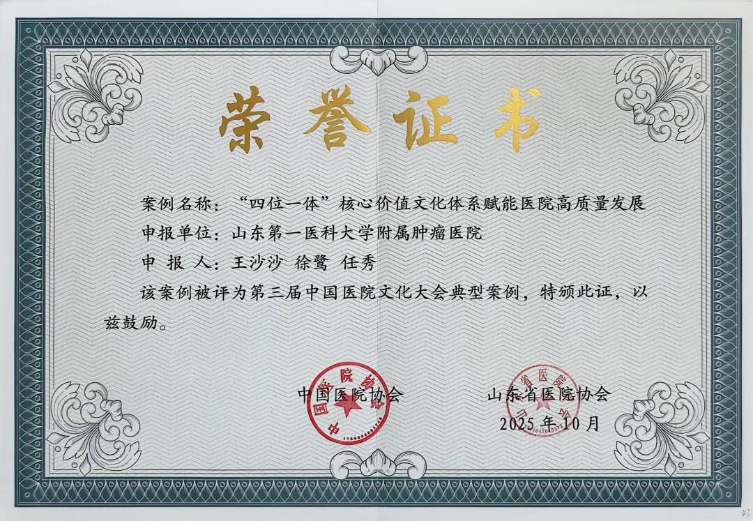 10月24日至26日,第三届中国医院文化大会在山东曲阜成功召开,山东第一医科大学附属肿瘤医院报送案例《“四位一体”核心价值文化体系赋能医院高质量发展》荣获第三届中国医院文化大会典型案例。