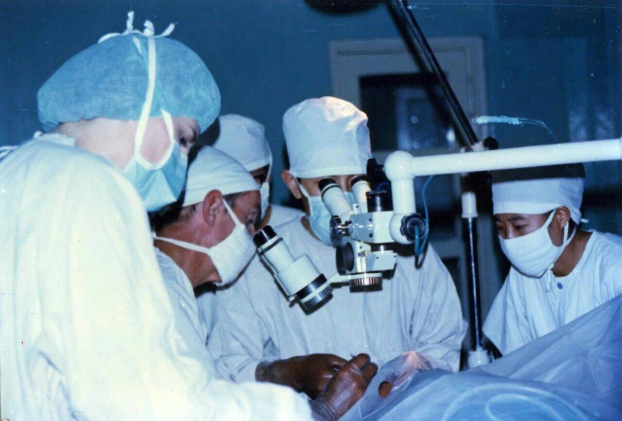 1983年,美国医疗手术队在潍坊观摩谢立信手术。