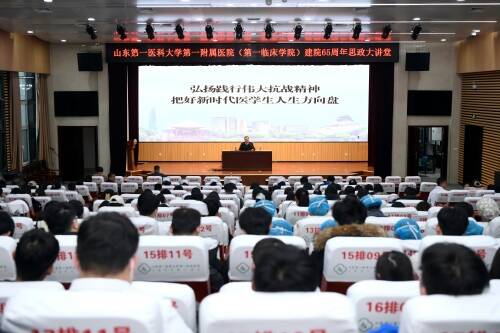 11月26日下午,山东第一医科大学第一附属医院第八期思政大讲堂如期举行。本期由校(院)党委委员、医院党委书记孙志坚主讲,面向在院实习生、见习生及研究生开展思想政治教育,旨在引导医学生弘扬践行抗战精神,指引成长方向。第一临床学院副院长徐巍主持活动。
