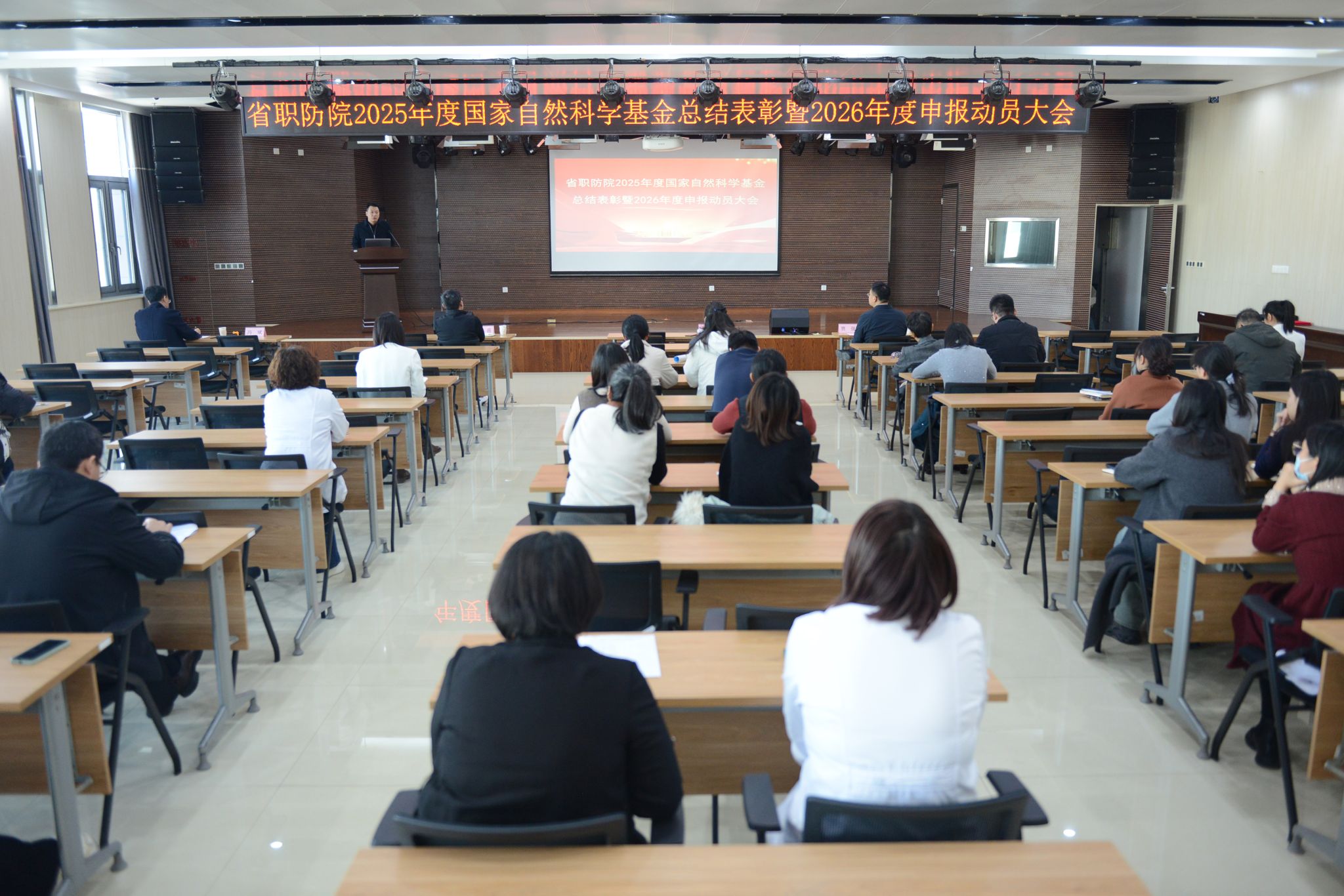 为系统总结和部署国家自然科学基金申报工作,11月26日,山东省职业卫生与职业病防治研究院召开2025年度国家自然科学基金总结表彰暨2026年度申报动员大会。党委书记、院长李昱作动员部署讲话,副院长贾强对2025年度科研工作及国家自然科学基金申报立项情况进行了全面系统总结分析,副院长冯斌主持会议。院领导班子成员、各科室负责人、2026年度国家自然科学基金拟申报人员、副高及以上职称和硕士及以上学历人员、在读博士及博士后等70余人参加会议。