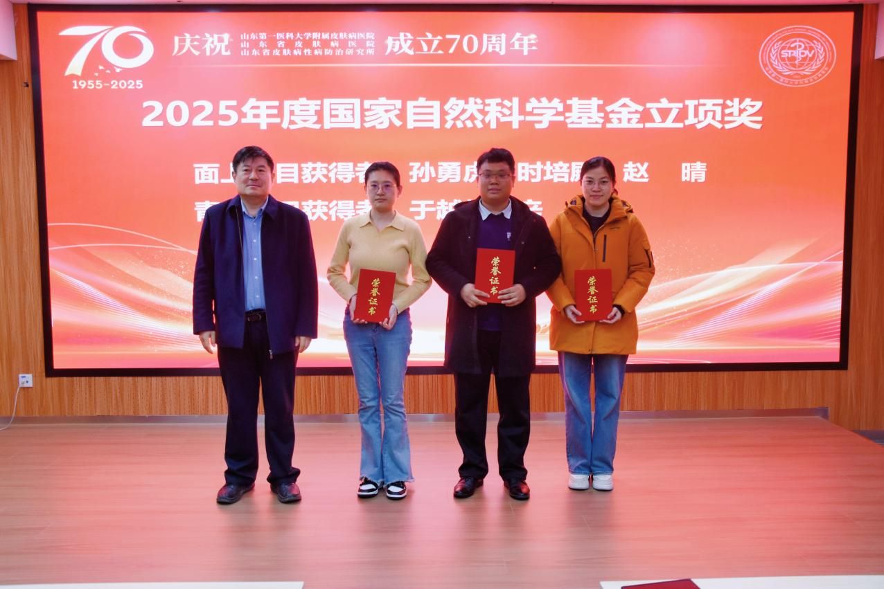 院长张福仁为2025年国家自然科学基金立项奖获得者代表时培殿、赵晴、于越乾颁发荣誉证书。