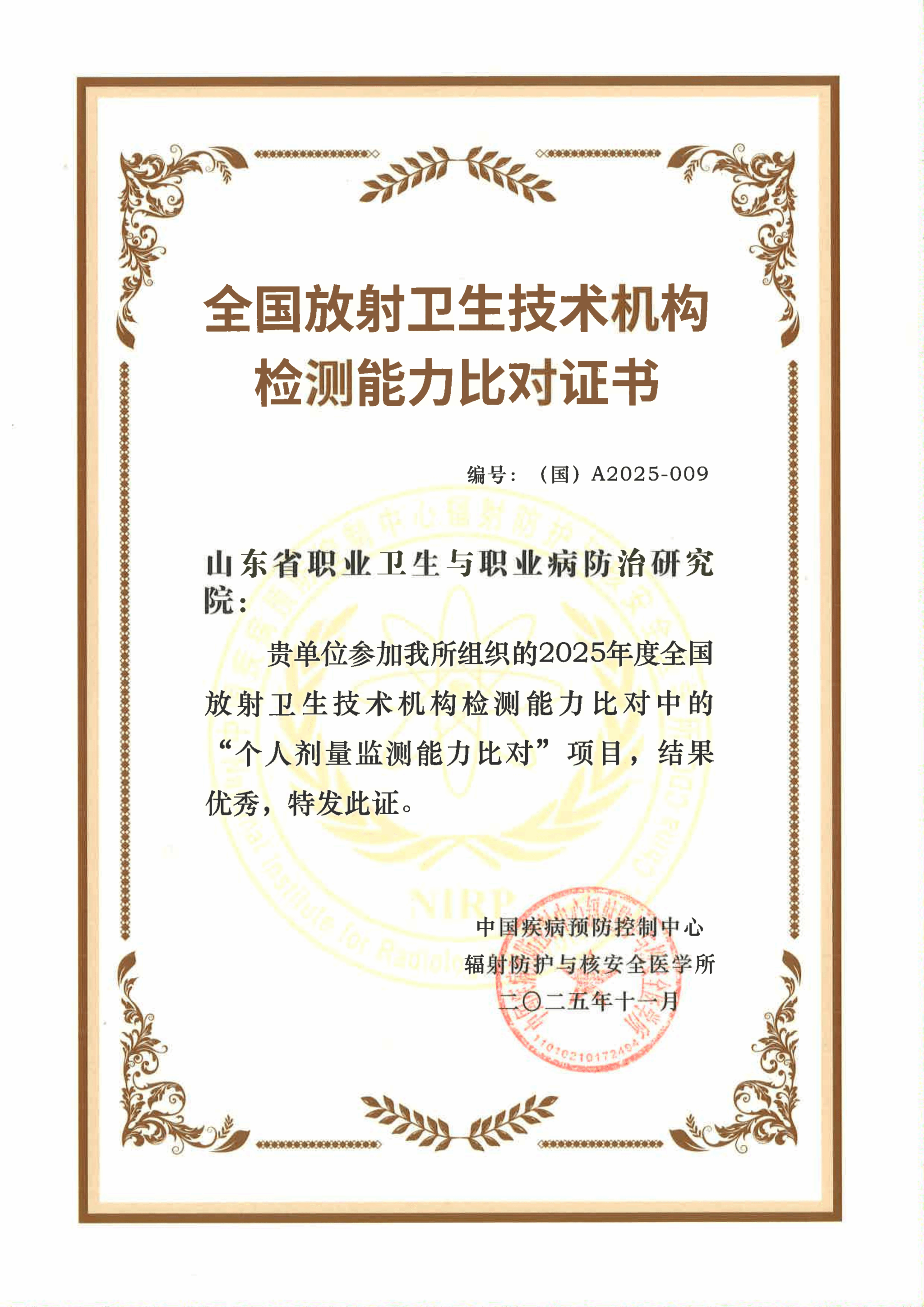 全国放射卫生技术机构检测能力比对是由中国疾控中心辐射安全所牵头开展的国家级权威能力考核,是衡量放射卫生行业技术水平、压实全行业质量控制责任的核心平台。作为具备专业资质的放射卫生技术服务机构,山东省职防院始终将技术能力提升与质量管控贯穿工作全程,自取得资质以来,已实现个人剂量监测能力比对连续五年全通过,其中三次获评“优秀”等级。