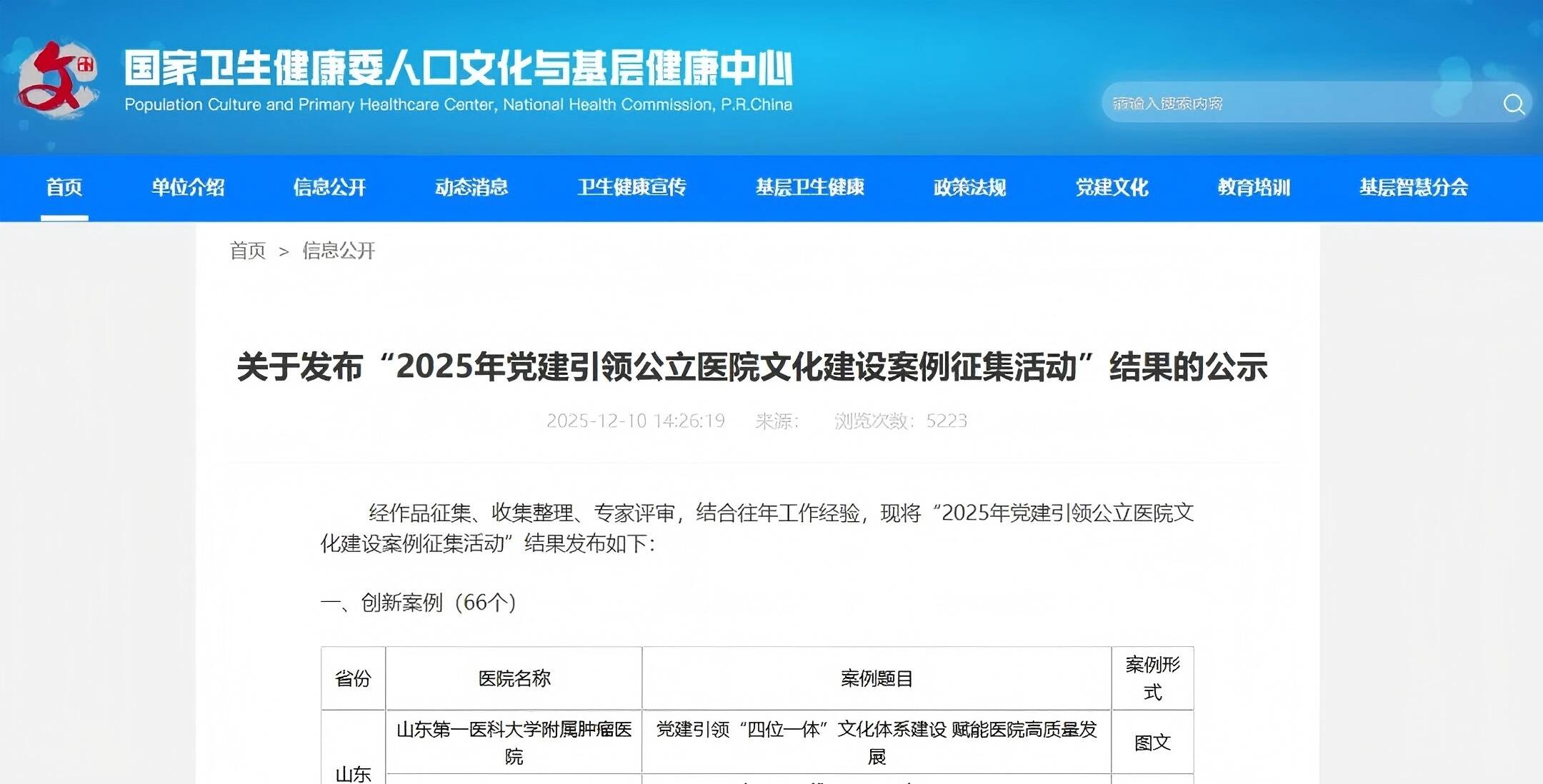 1月6日,国家卫生健康委人口文化与基层健康中心公布了全国“2025年党建引领公立医院文化建设案例征集活动”结果,山东第一医科大学附属肿瘤医院报送案例“党建引领‘四位一体’文化体系建设 赋能医院高质量发展”获评创新案例。