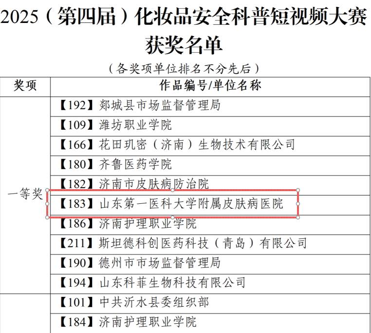 近日,2025山东省化妆品安全科普短视频大赛获奖名单正式公布。山东第一医科大学附属皮肤病医院张会敏医生的原创科普作品《挑选洗面奶,成分党有话说》获得一等奖。
