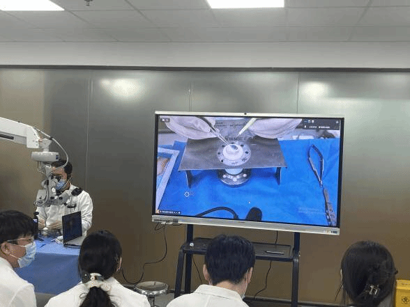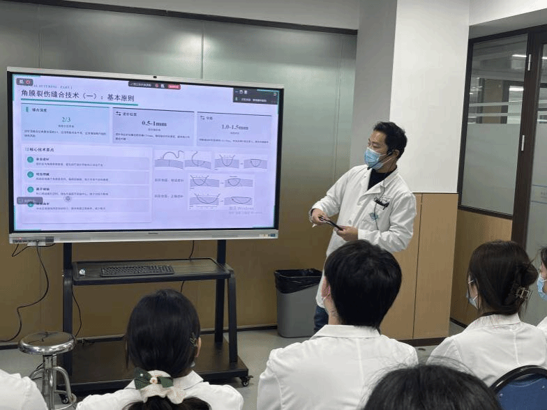 随后,角膜病科副主任医师王爽系统讲解了角巩膜缝合的适应证、缝合原则、缝线选择、进针角度、打结技巧及并发症处理等关键理论知识,尤其强调了缝合操作对术后视觉质量的重要影响。