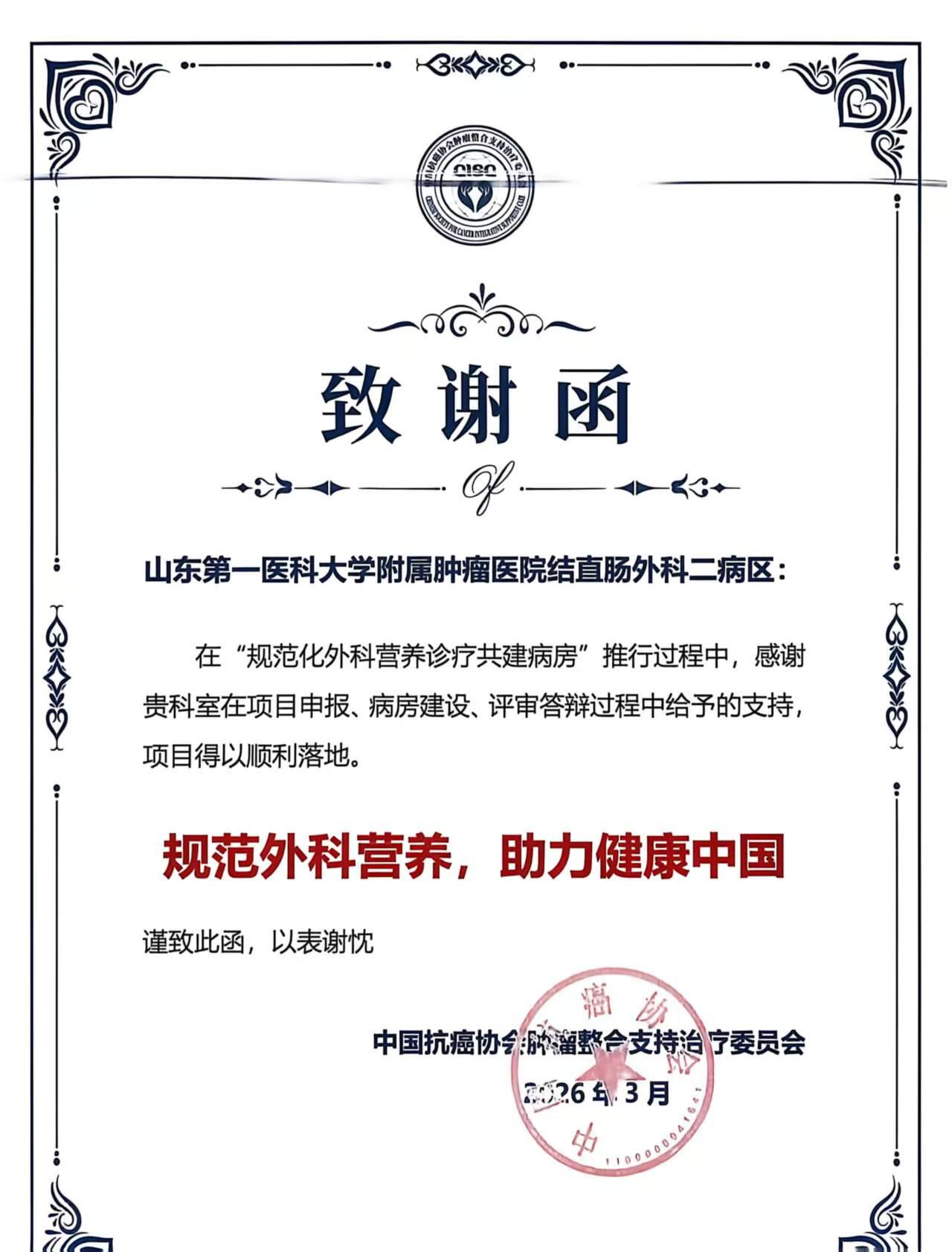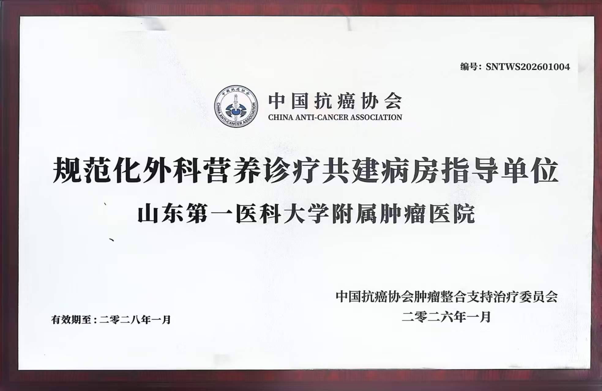 近日,由中国抗癌协会肿瘤整合支持治疗委员会主办的“规范化外科营养诊疗共建病房项目2025年度总结暨2026年度启动会”在成都举办。会上,山东第一医科大学附属肿瘤医院结直肠外科二病区凭借在规范化外科营养诊疗示范病房建设中的突出成效与行业影响力,荣获国家级“规范化外科营养诊疗共建病房指导单位”称号,为山东省首家获此殊荣的单位。此次会议,全国共162家医院(科室)获评“规范化外科营养诊疗共建病房”,其中仅遴选20家突出单位授予指导单位称号。