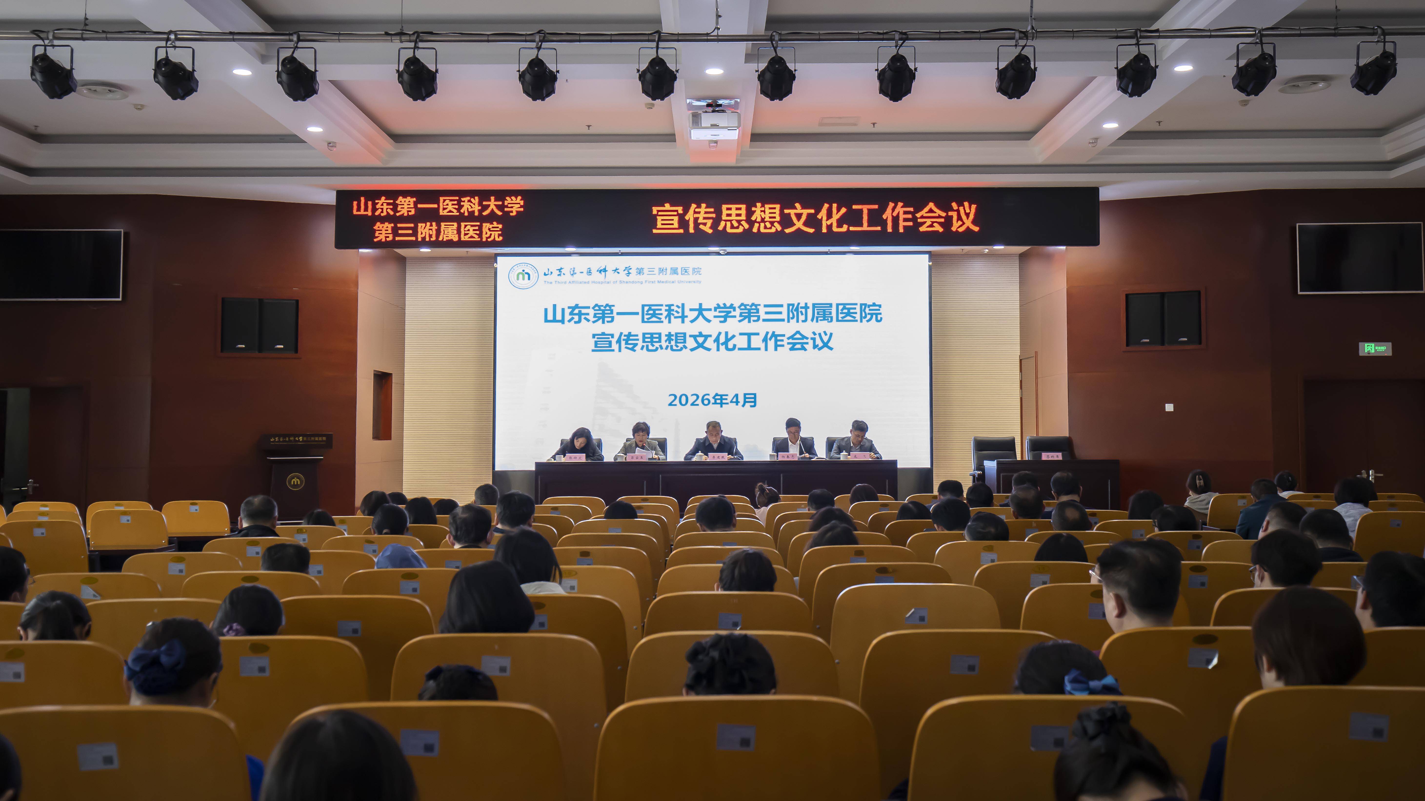 4月21日,山东第一医科大学第三附属医院召开2026年宣传思想文化工作会议。会议以习近平新时代中国特色社会主义思想为指导,全面贯彻党的二十大和二十届历次全会精神,深学笃行习近平文化思想,深入学习贯彻全省卫生健康宣传思想文化工作视频会议精神,全面落实校(院)2026年宣传思想文化工作部署,总结2025年工作成效,分析当前形势,部署2026年工作任务。医院在家领导班子成员,各党支部书记,全体中层干部,护士长及各部门、科室宣传通讯员参加会议。