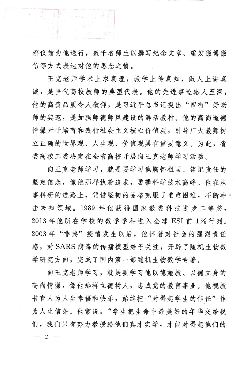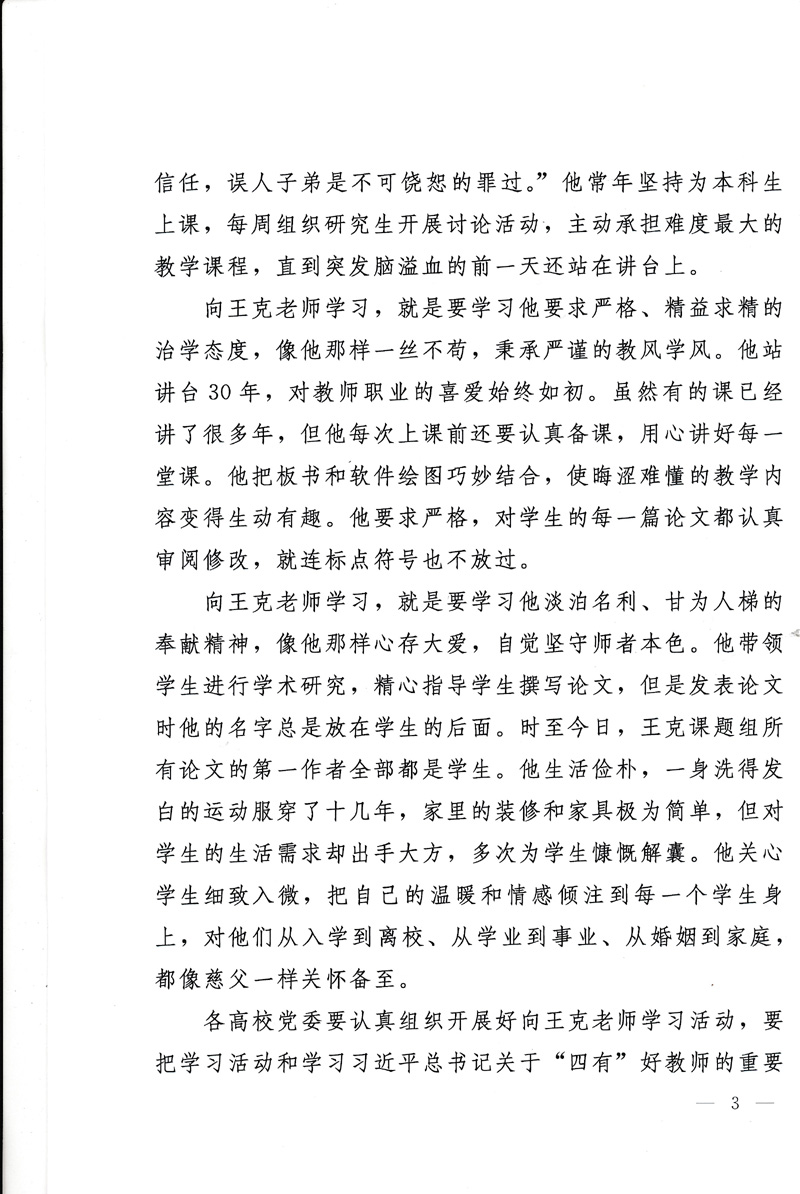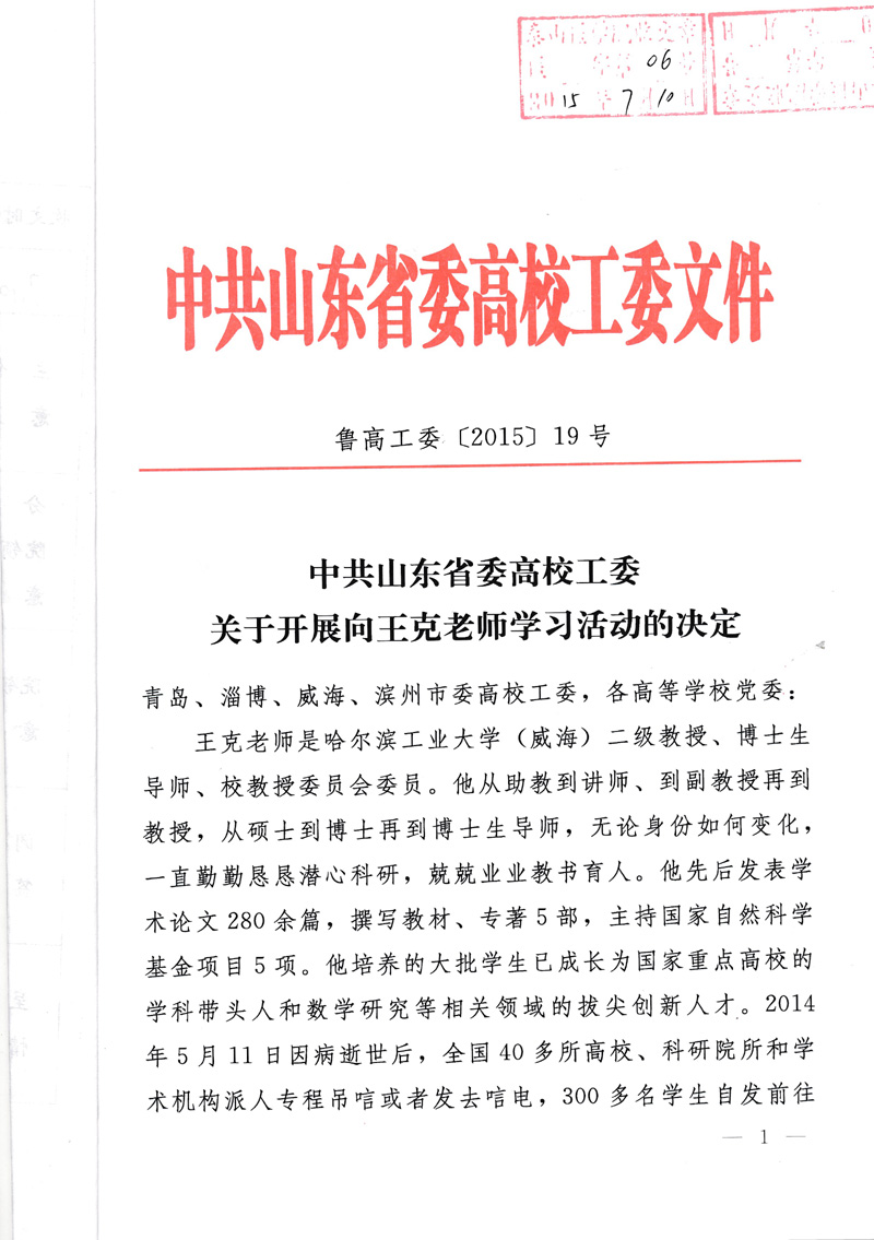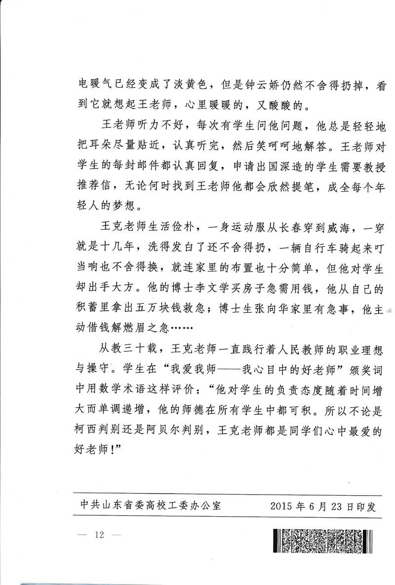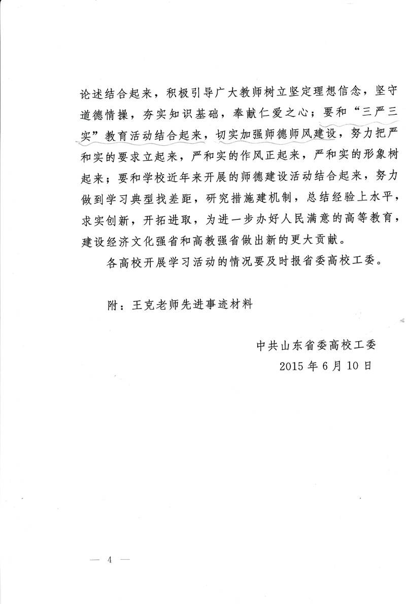 近期,中共山东省委高校工委下发《关于开展向王克老师学习活动的决定》(鲁高工委【2015】19号),要求各级党组织认真组织开展好向王克老师学习活动。请各单位根据文件精神(见附件)认真组织学习,并将学习情况及时报党委宣传部(邮箱xcb@tsmc.edu.cn),宣传部将对各单位学习情况进行宣传报道。