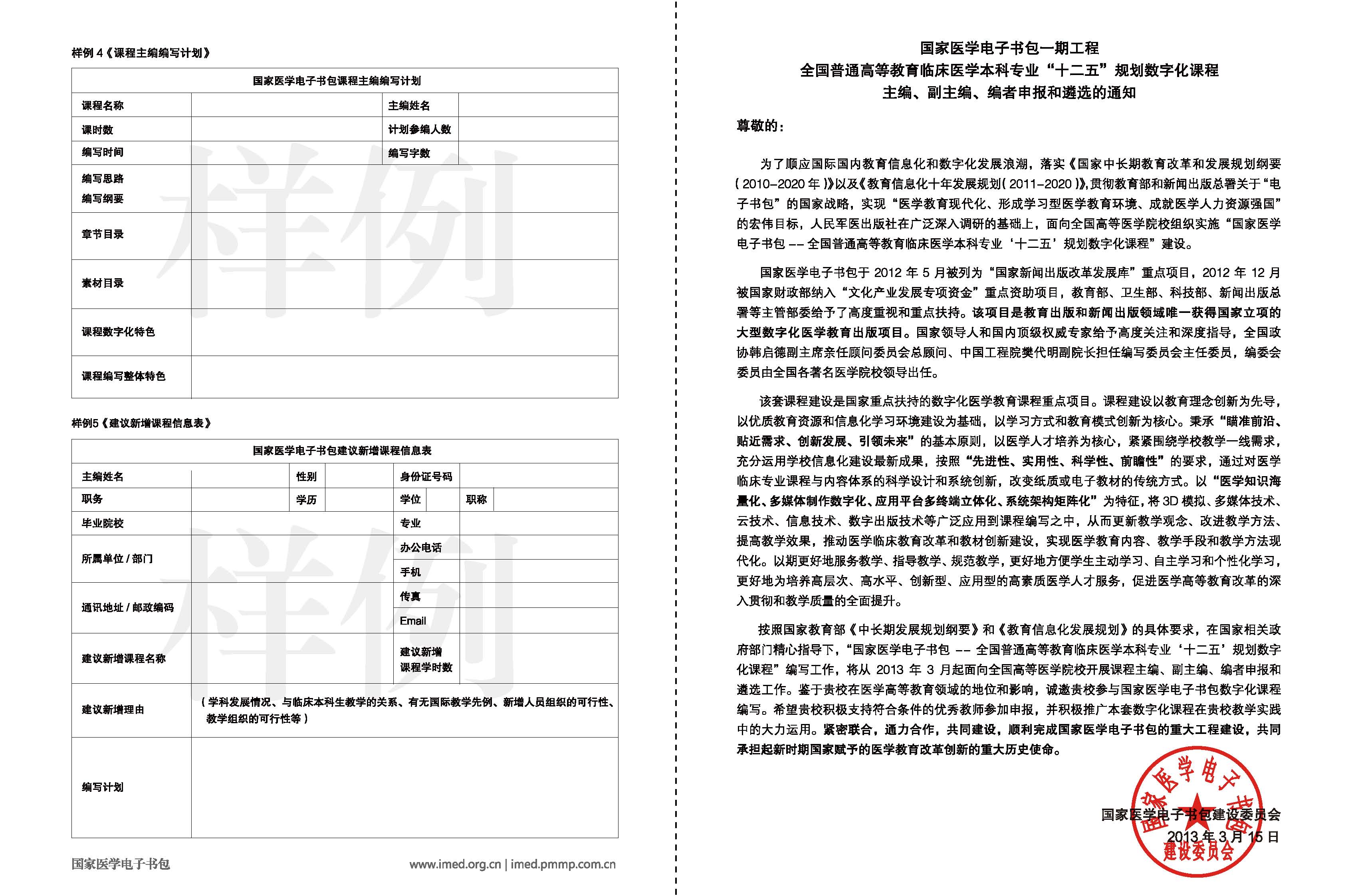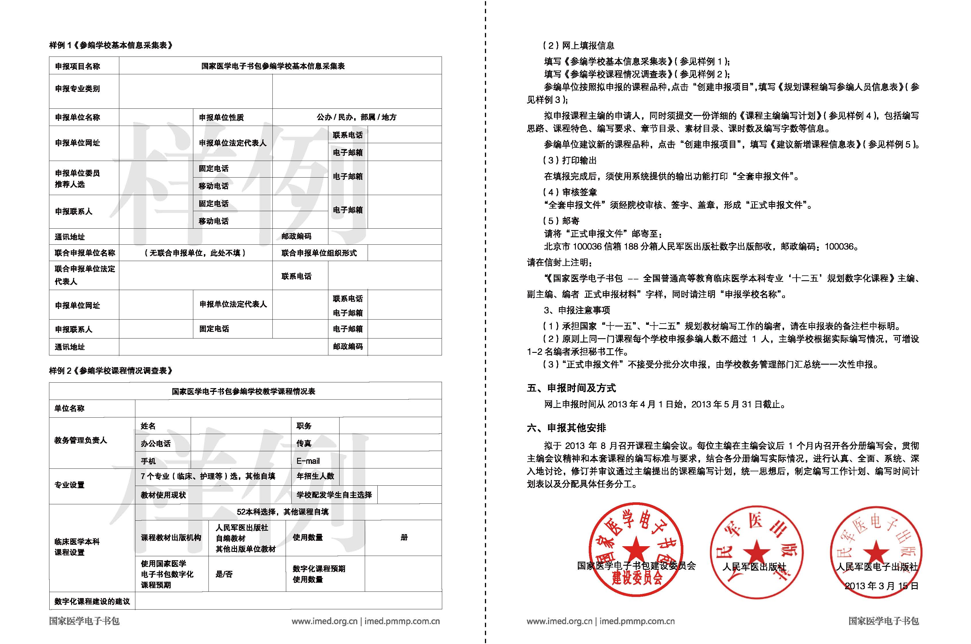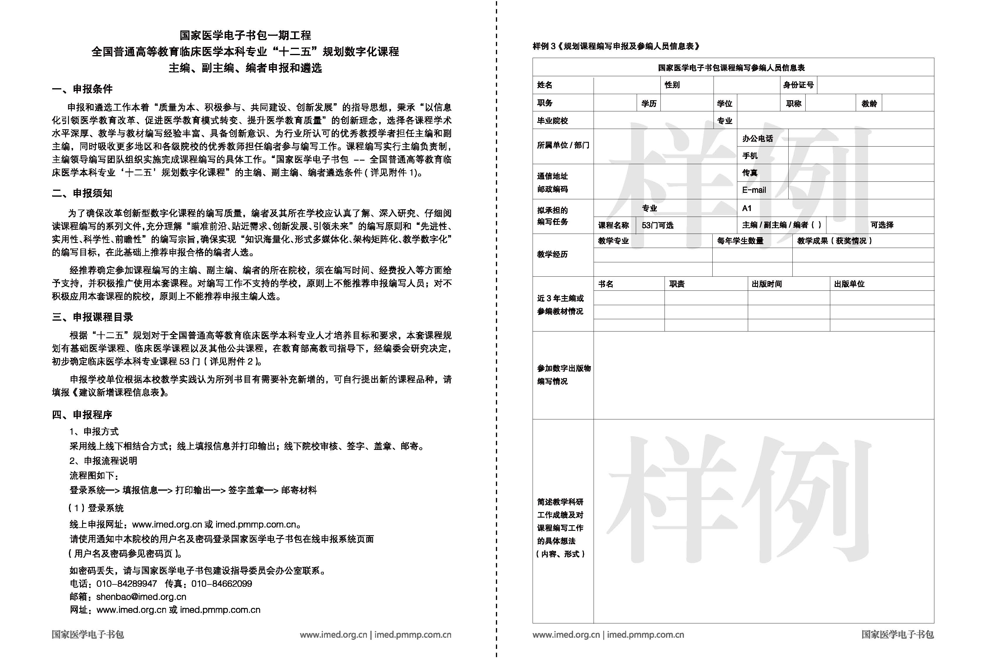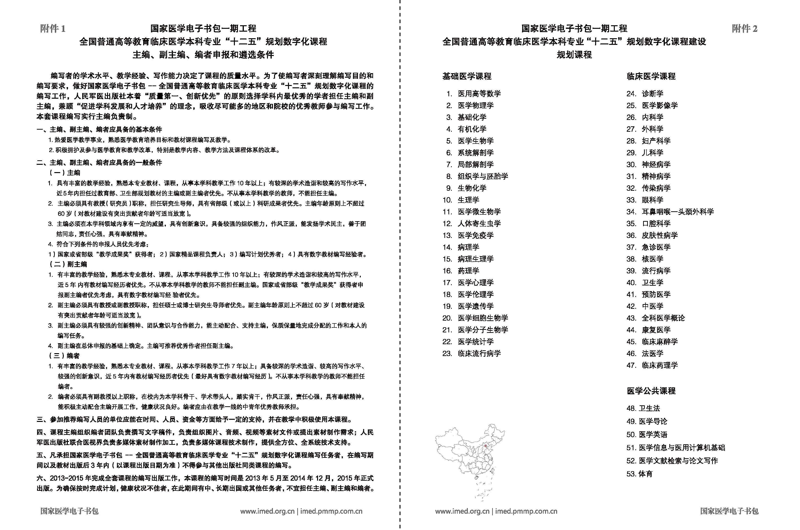 人民军医出版社面向全国高等医学院校组织实施“国家医学电子书包—全国普通高等教育临床医学本科专业十二五规划数字化课程”建设,专业课程及主编、副主编、编者遴选条件见附件。请各学院(部)组织相关人员积极申报,并将申报材料纸质版、电子版于2013年5月20日下午4:00前报教务处教材图书供应中心。