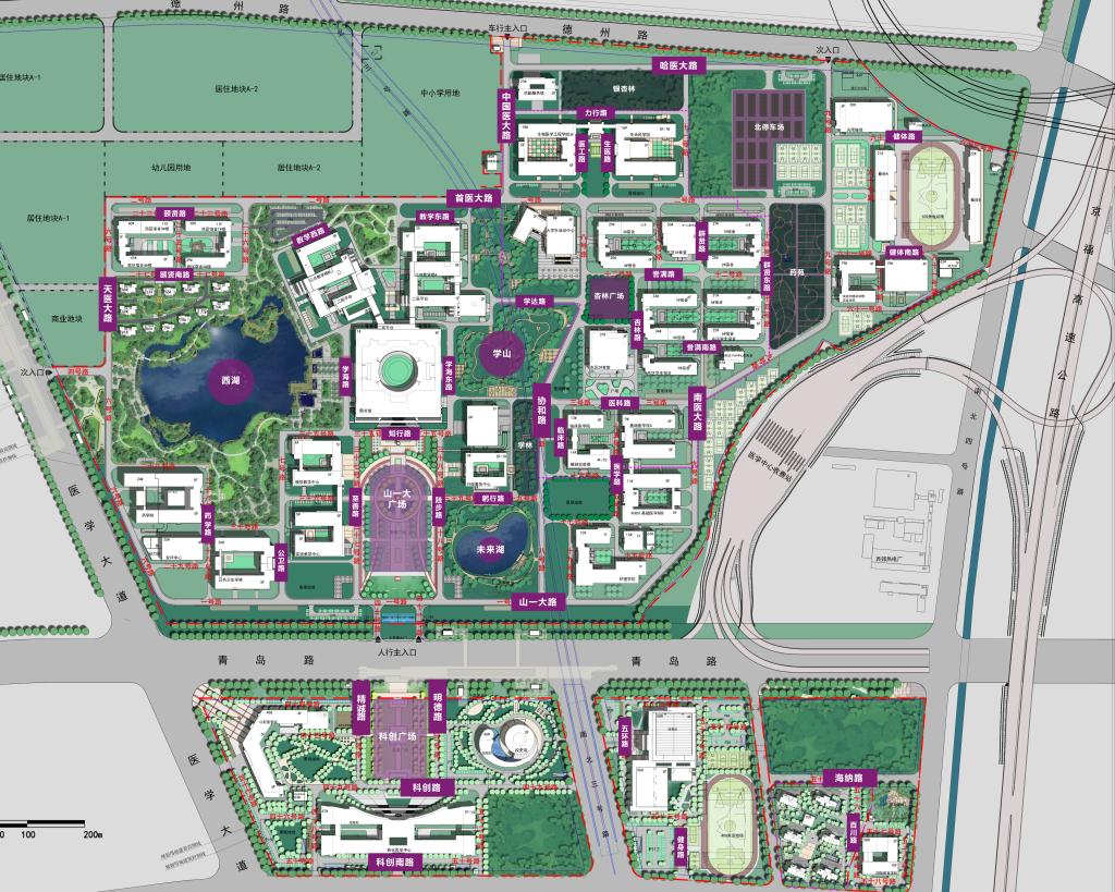 两湖——未来湖、西湖 三广场——山一大广场、科创广场、杏林广场 四园林——学山、学林、药苑、银杏林 |