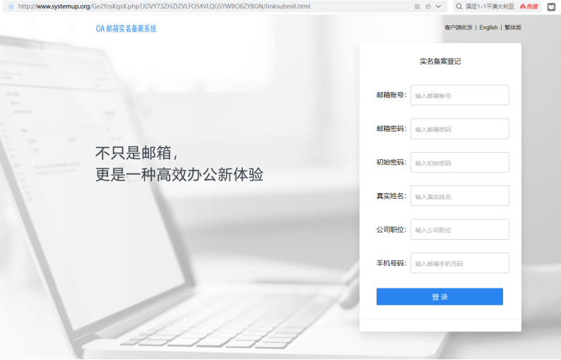 一旦用户点击进行升级按钮,则提示输入邮箱账号、密码、真实姓名和手机号等个人敏感信息,如下图。一旦用户上当,如实填报上述信息,信息将被窃取,造成十分严重的后果。