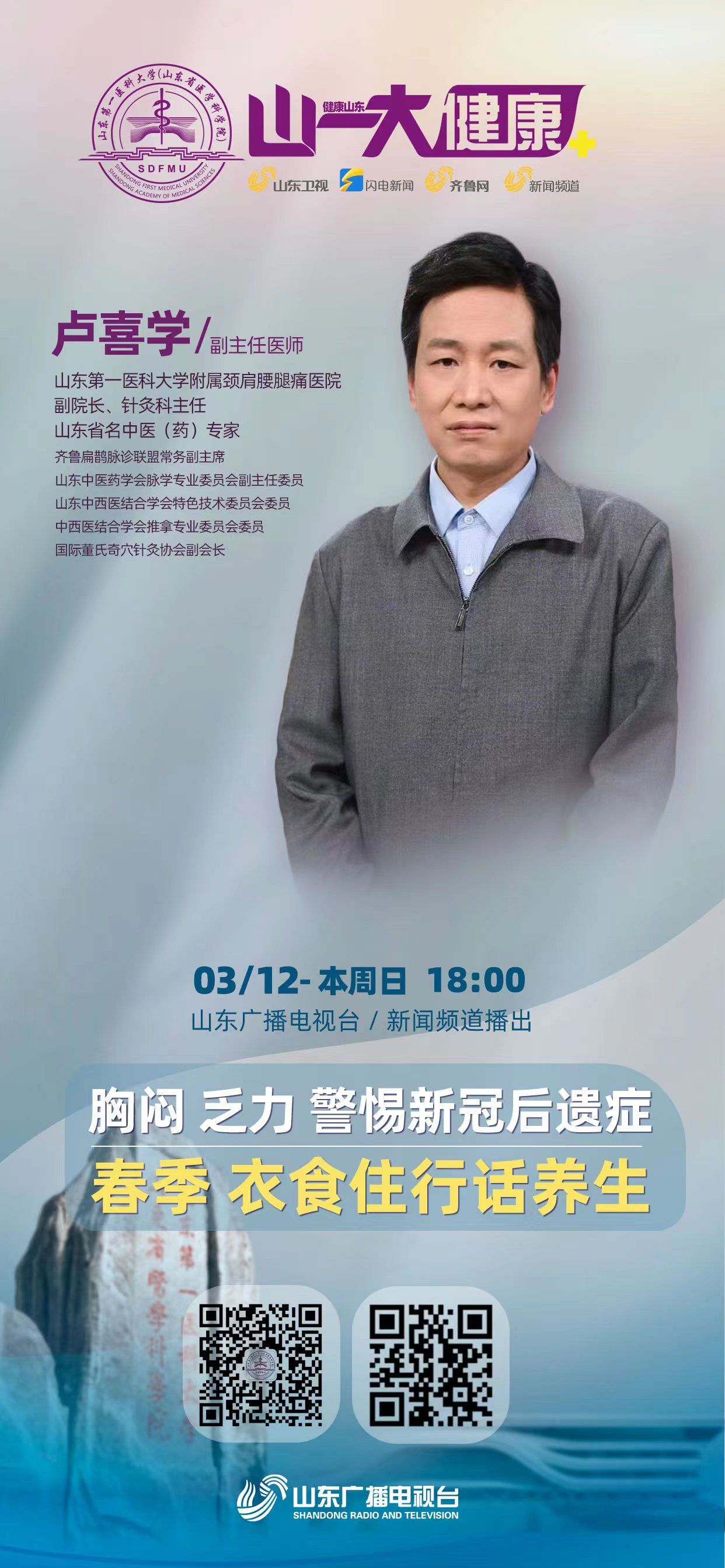 春季健康易受影响,中医视角如何解释?春季养生要遵循哪些原则?“春夏养阳,秋冬养阴”,是什么原理?“春捂秋冻”的法则是什么?哪些食物适合养生?春天为何是抑郁症高发季节?艾灸有何注意事项?哪些中药适合代茶饮?其配比如何?是否可每日饮用?甘草干姜汤、安宫牛黄丸能预防感冒吗?生活起居注意哪些方面可起到养生的效果?“夜卧早起”的时间段是什么时候?哪些运动适合春季养生?本期“名医说”,邀请山东第一医科大学附属颈肩腰腿痛医院专家为您科普春季养生知识,敬请收看节目,获取更多健康资讯。