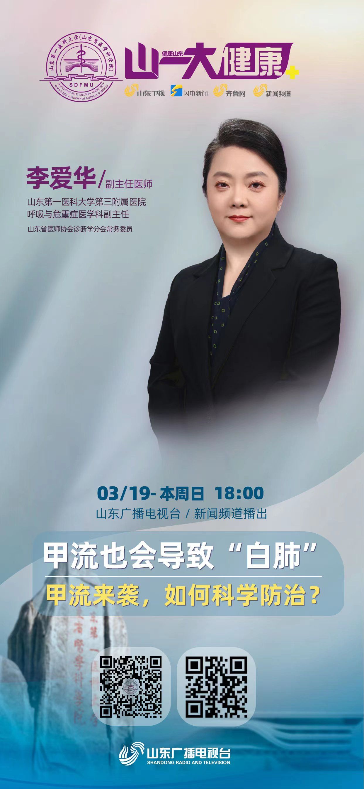 甲流与流感有何关系?如何区分?甲流为何会引发“白肺”?流感引发严重疾病并发症和死亡的高危人群有哪些?如何预防甲流重症?目前常用的抗病毒药、退烧药、缓解鼻塞药、止咳止痰药、止吐止泻药、复方剂分别有哪些,如何使用?流感疫苗的最佳接种时间是什么时候?本期“名医说”,邀请山东第一医科大学第三附属医院专家为您科普甲流防治相关知识,敬请收看节目,获取更多健康资讯。