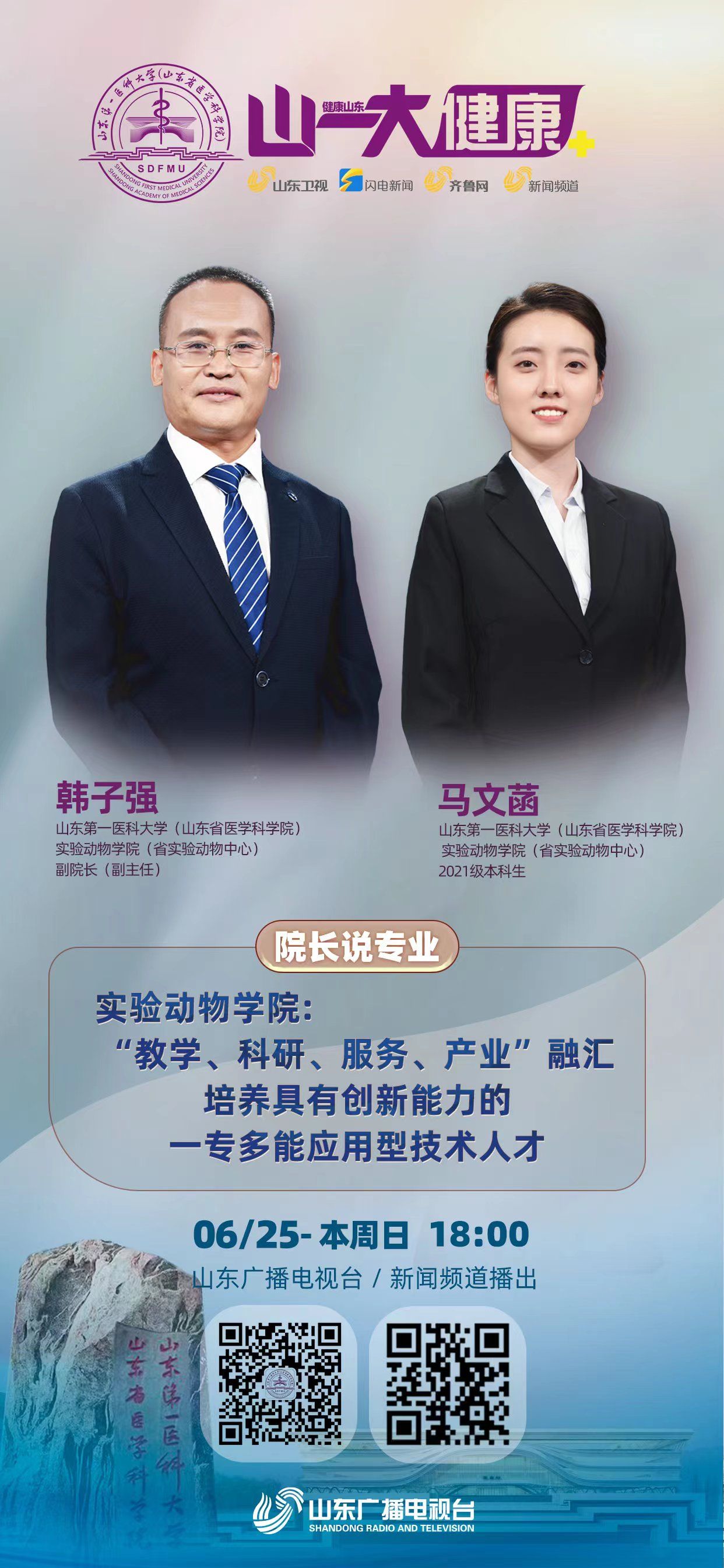 为吸引优秀生源,多措并举开展招生宣传,扩大校(院)招生宣传广度、力度,校(院)与山东广播电视台合作推出《直通高考·院长说专业》系列访谈,邀请各学院的院长们走进演播室,针对考生和家长们关注的问题,解疑答惑。本期节目邀请山东第一医科大学(山东省医学科学院)实验动物学院(省实验动物中心)副院长韩子强、2021级本科生马文菡,做客演播室,与您聊聊实验动物学院(省实验动物中心)。