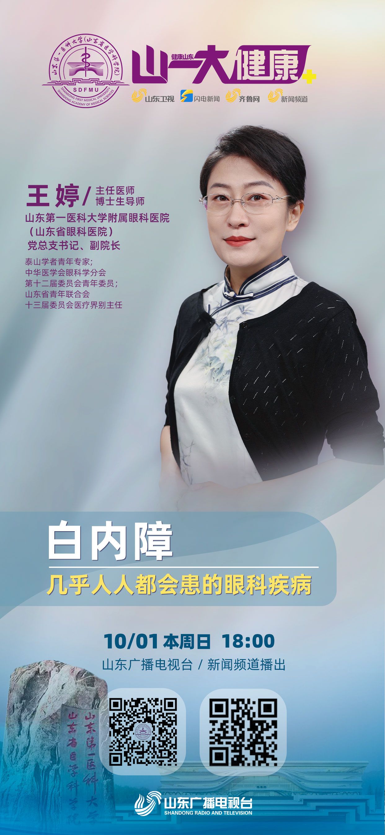 白内障的发病机制是怎样的?哪些人群白内障发病率高?患上白内障,视力会发生什么变化?白内障有哪些症状?外伤可能引发白内障吗?哪些因素会促使白内障早发?白内障与紫外线有关吗?治愈白内障的有效手段是什么?白内障手术是如何进行的?白内障日间手术流程是怎样的?患者视力恢复最佳状态需要多长时间?白内障的黄金窗口期是什么时候?人工晶体如何选择?白内障手术后会复发吗?白内障手术后后发障多数可通过什么方式治疗?如何进行白内障自测?本期“名医说”邀请山东第一医科大学附属眼科医院专家为您科普白内障防治相关知识,敬请收看节目,获取更多健康资讯。