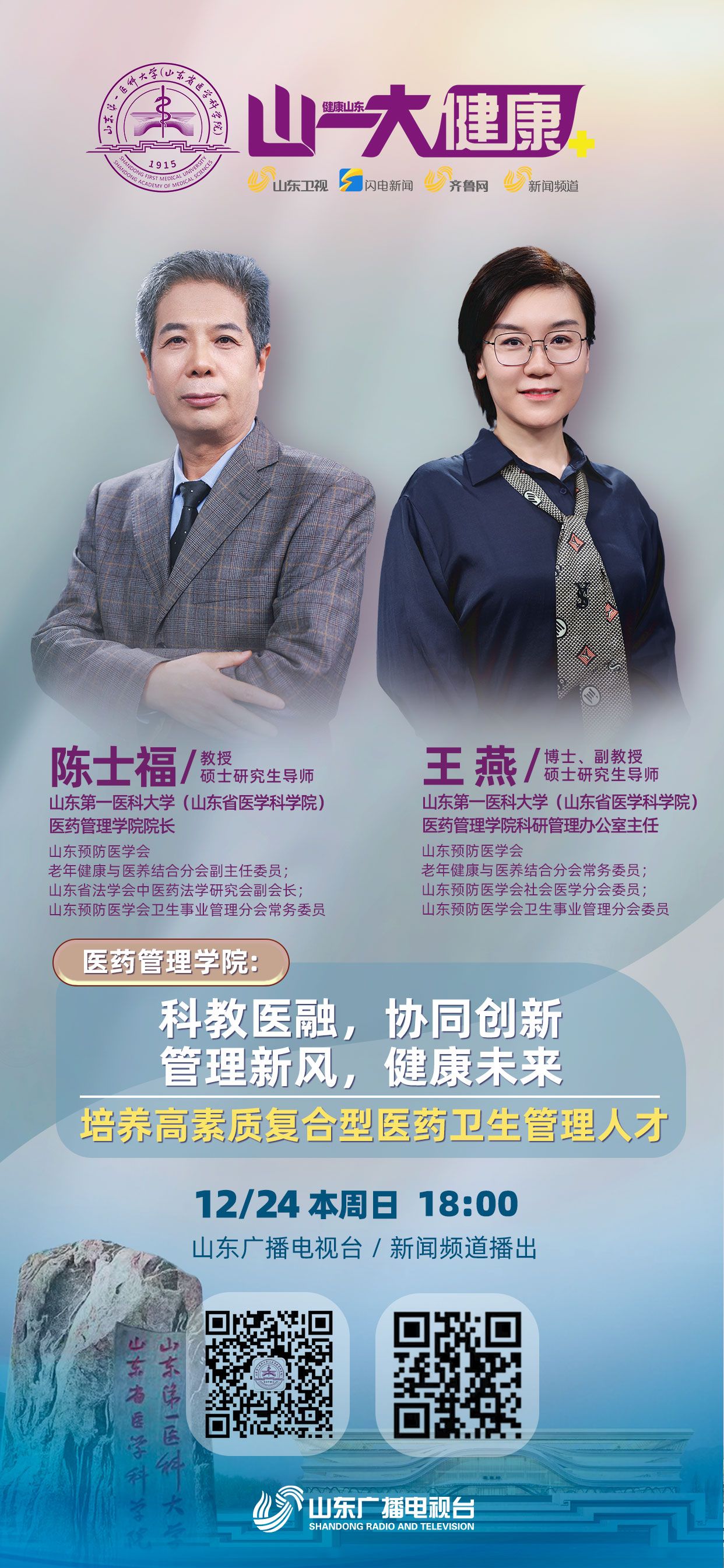 医药管理学院培养什么人才?学院专业设置及各专业人才培养方向是怎样的?医疗卫生行业对医管人才的需求如何?在人才培养模式方面,学院有哪些创新及提升?科教融合和医教协同在人才培养方面发挥什么作用?在科研创新方面,学院搭建了哪些平台?学院师资情况如何?为教师成长提供哪些助力?在学科建设方面,学院做了哪些努力?取得了什么成绩?学院在引导学生参加专业赛事方面,采取了哪些举措?取得了怎样的赛事成绩?学院在助力学生参加社会实践方面,采取了哪些措施?学院考研方向及考研情况如何?学院毕业生就业方向及就业前景如何?在促就业方面,学院为学生提供了哪些便利条件?在出国留学方面,学院为学生提供哪些帮助?科教融合四年多来,学院有哪些方面的提升?学院毕业生有哪些竞争优势?本期节目邀请山东第一医科大学(山东省医学科学院)医药管理学院院长、科研管理办公室主任为您介绍相关情况,敬请收看节目,获取学院详情。