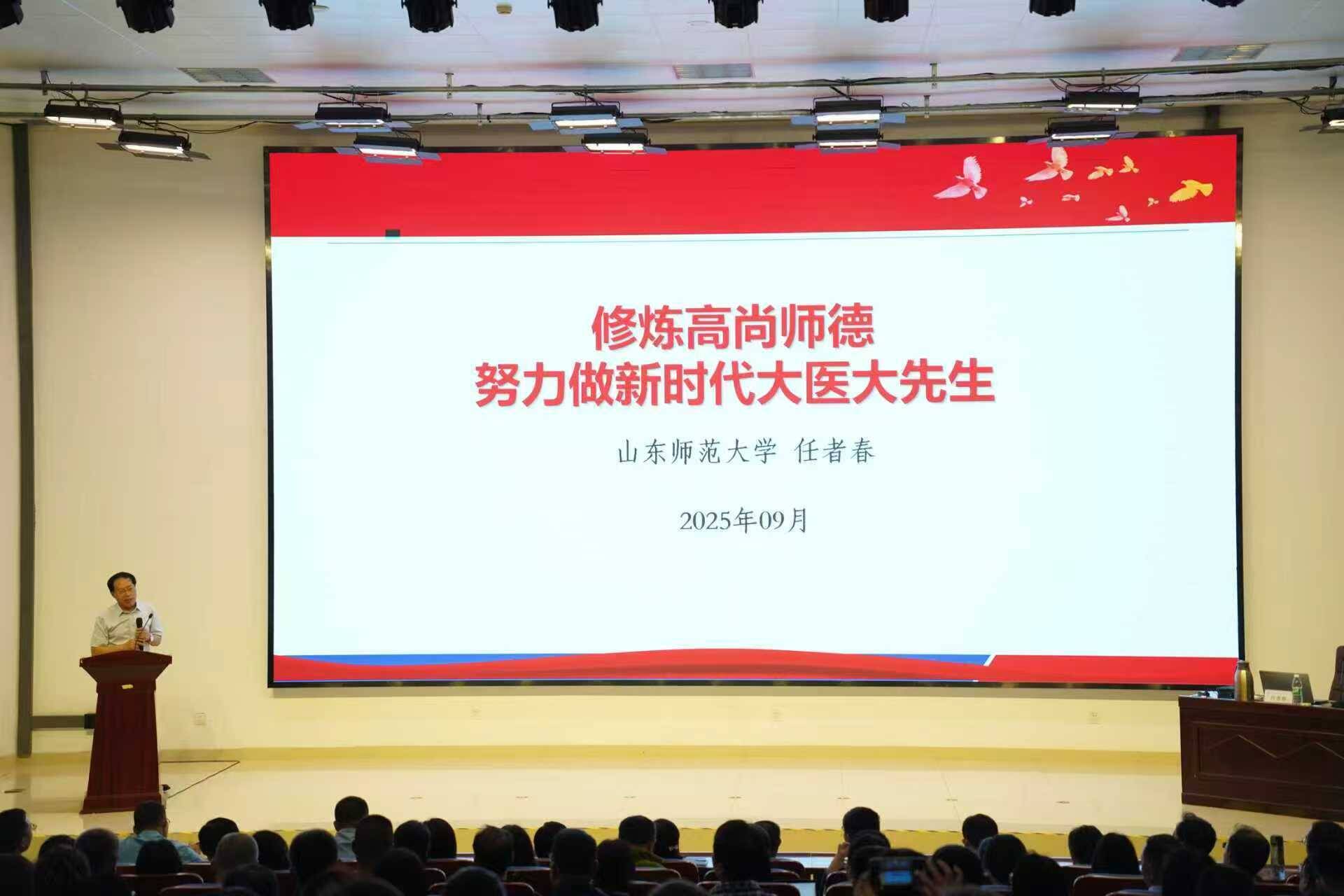 为深入学习贯彻习近平总书记关于教育的重要论述,进一步加强校(院)师德师风建设,9月17日,校(院)举办师德师风专题培训会。培训会特邀山东师范大学马克思主义学院博士生导师任者春教授作《修炼高尚师德 努力做新时代大医大先生》专题讲座。