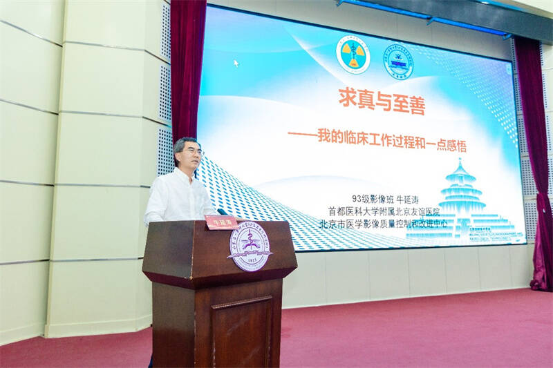 论坛核心环节,四位优秀校友代表依次登台,带来兼具深度与实践价值的专题报告。首都医科大学附属北京友谊医院放射科副主任、医学影像技术专业1993级校友牛延涛,以《求真与至善:我的临床研究过程和一点感悟》为题,分享从医心得。作为北京放射技师领域的代表人物,他创下多项“北京首次”:首获国家与北京市自然科学基金,首获科技新星计划、卫生高层次人才称号,率先拿下博士学位并晋升教授、博导,牵头起草国家标准,论文获评中国科协优秀论文。凭借硬核实力突破领域发展瓶颈,为放射技术发展树立标杆。他语重心长地叮嘱学弟学妹:科研与从医之路需沉心笃行,唯有耐得住寂寞,方能守得住初心、攀得上高峰。